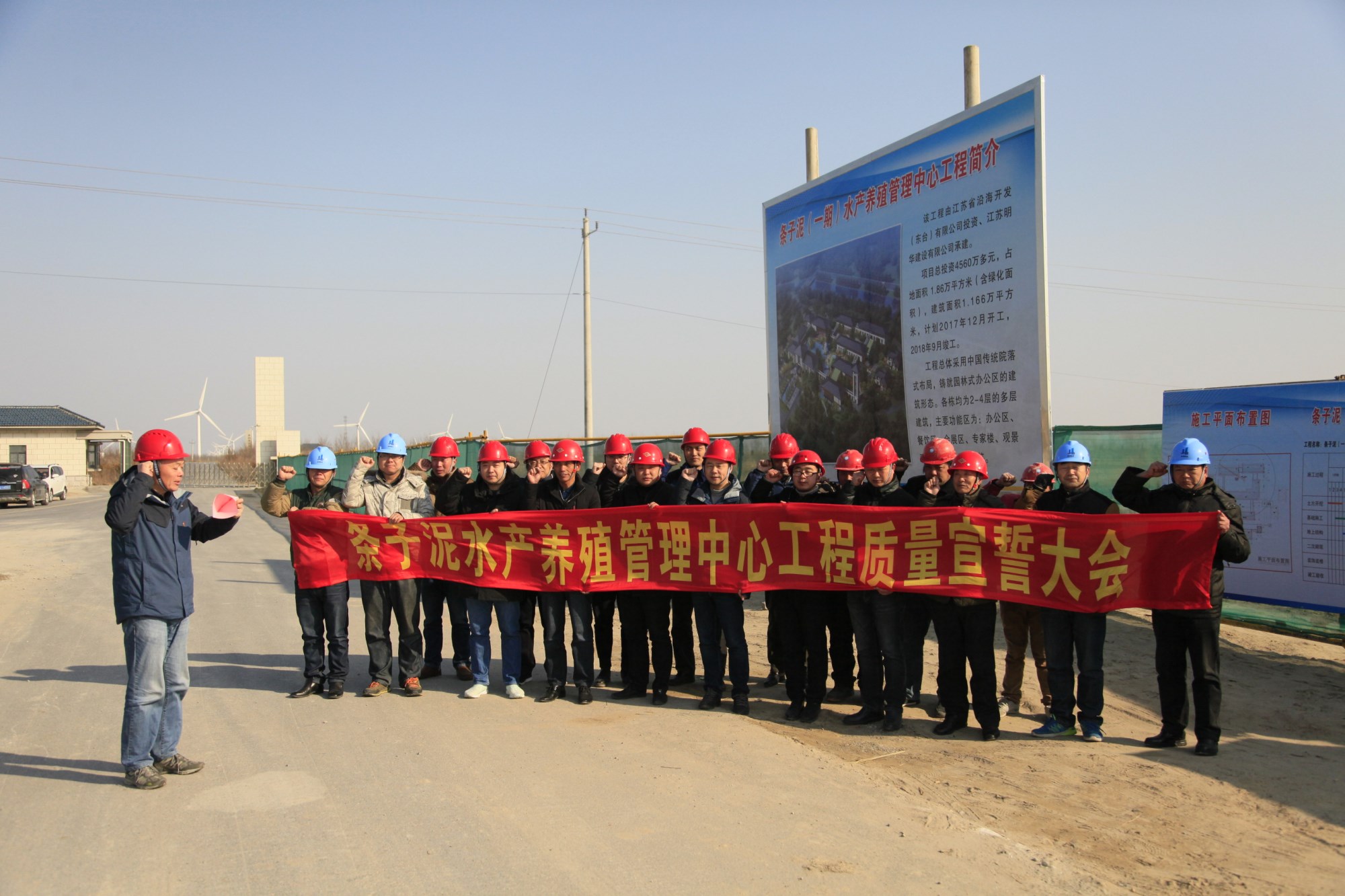 2018年2月7日,为进一步强化质量意识,铸就精品工程,东台公司组织开展条子泥水产养殖管理中心工程质量宣誓活动。常务副总经理王海祥带领公司领导班子、项目管理人员和各参建单位现场负责人、施工班组长一起郑重宣誓:在条子泥水产养殖管理中心项目建设中,牢记质量标准,明确质量目标,规范质量管理,严格质量控制。杜绝不良材料进入工程,保证工程不出次品,不留隐患,以实际行动确保工程质量优良。